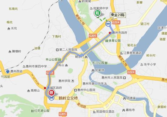 图片2:广州白云国际机场惠州候机楼到上排市场【从惠州候机楼沿图片3虚线的路线,步行到惠州市慈云图书馆旁的公交站台,乘坐29路公交车,在上排市场站下车】