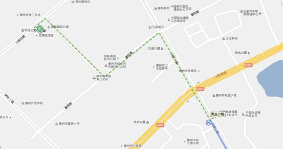 从惠州汽车站到上排职工宿舍的位置路线图请参考下图:
